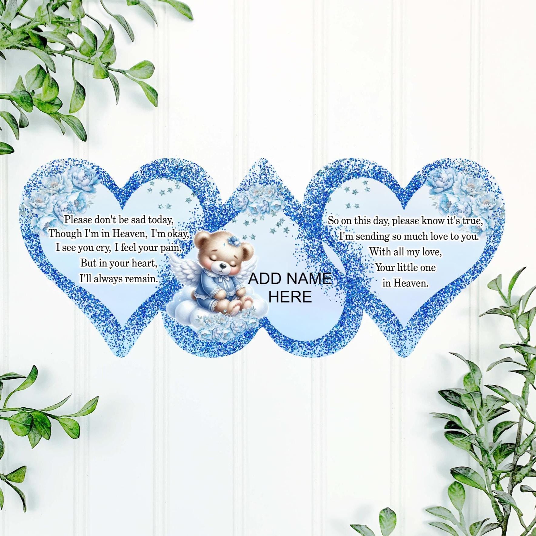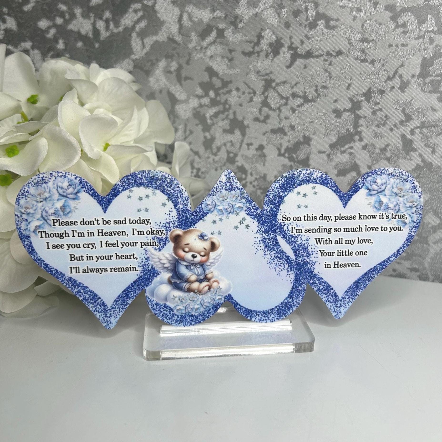 This beautiful infant remembrance heart plaque serves as a touching memorial keepsake for your cherished little one. Featuring two interlocking hearts, it comes with our heartfelt poem: "Please don't be sad today, though I'm in heaven, I'm okay. I see you cry, I feel your pain, but in your heart, I'll always remain..." You can personalize it with your own text or name inside the central heart by providing details at checkout. The plaque measures 18cm by 7.5cm and includes a clear 5mm stand. Delivered flat-packed for safe transit, it’s easy to assemble by slotting the pieces into the stand. Please verify all spellings before ordering; colours may vary slightly from on-screen views.