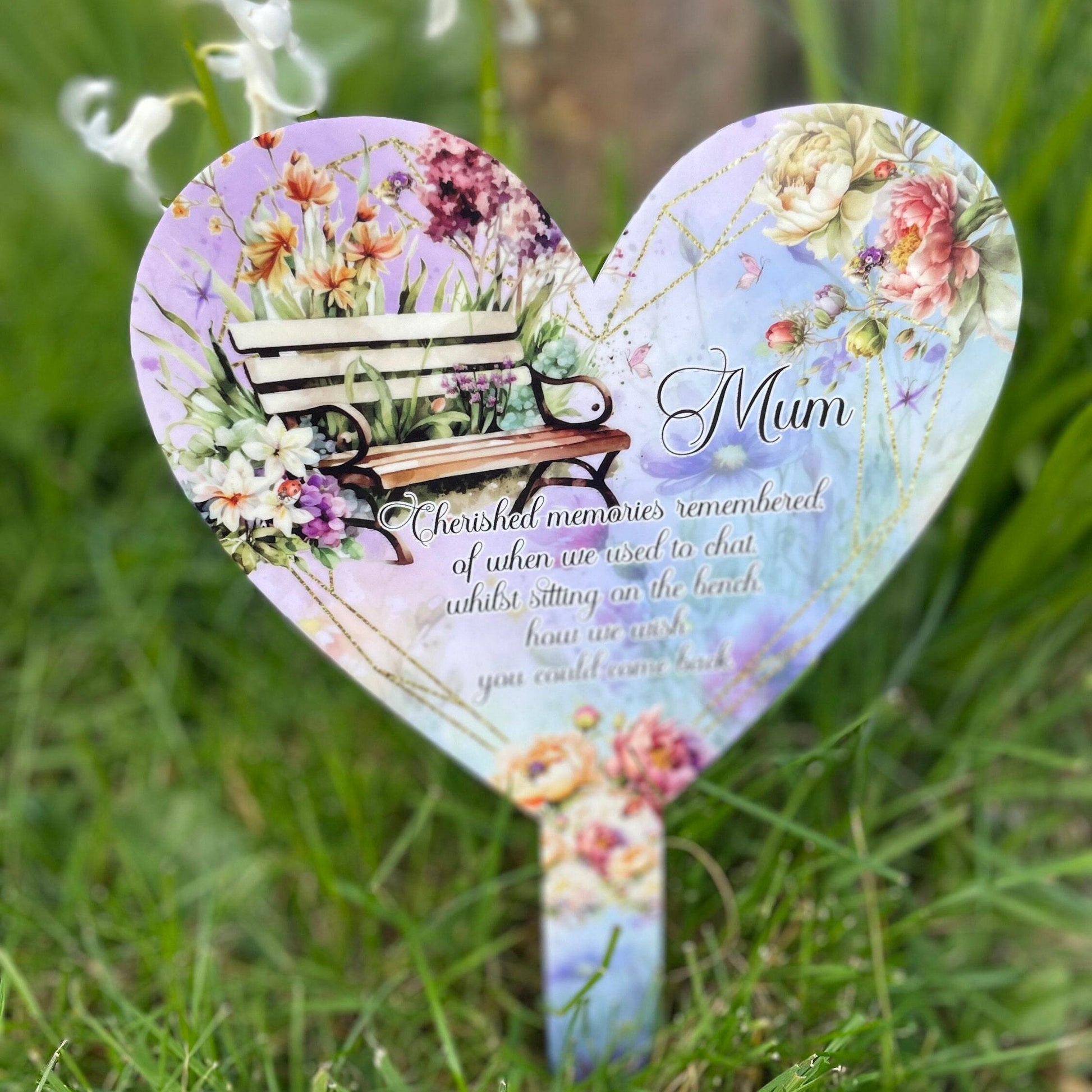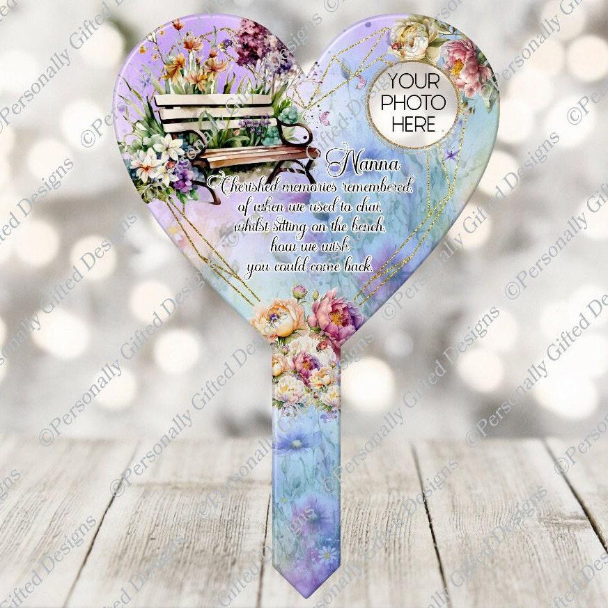 Our Floral Bench Memorial Heart Grave Marker offers a dignified way to honour a cherished loved one. Ideal for placement in gardens, at gravesides, or within plant pots, this heartfelt design features a flower bench poem which can be customized with your own text and photo, or you may select from our suggested inscriptions. Please provide personalization details and a high-resolution image for upload. Crafted from durable 3mm acrylic with a high-quality sublimation print, this marker withstands outdoor conditions while retaining vibrant colours. Dimensions are approximately 27.2cm by 19cm, making it a lasting tribute.