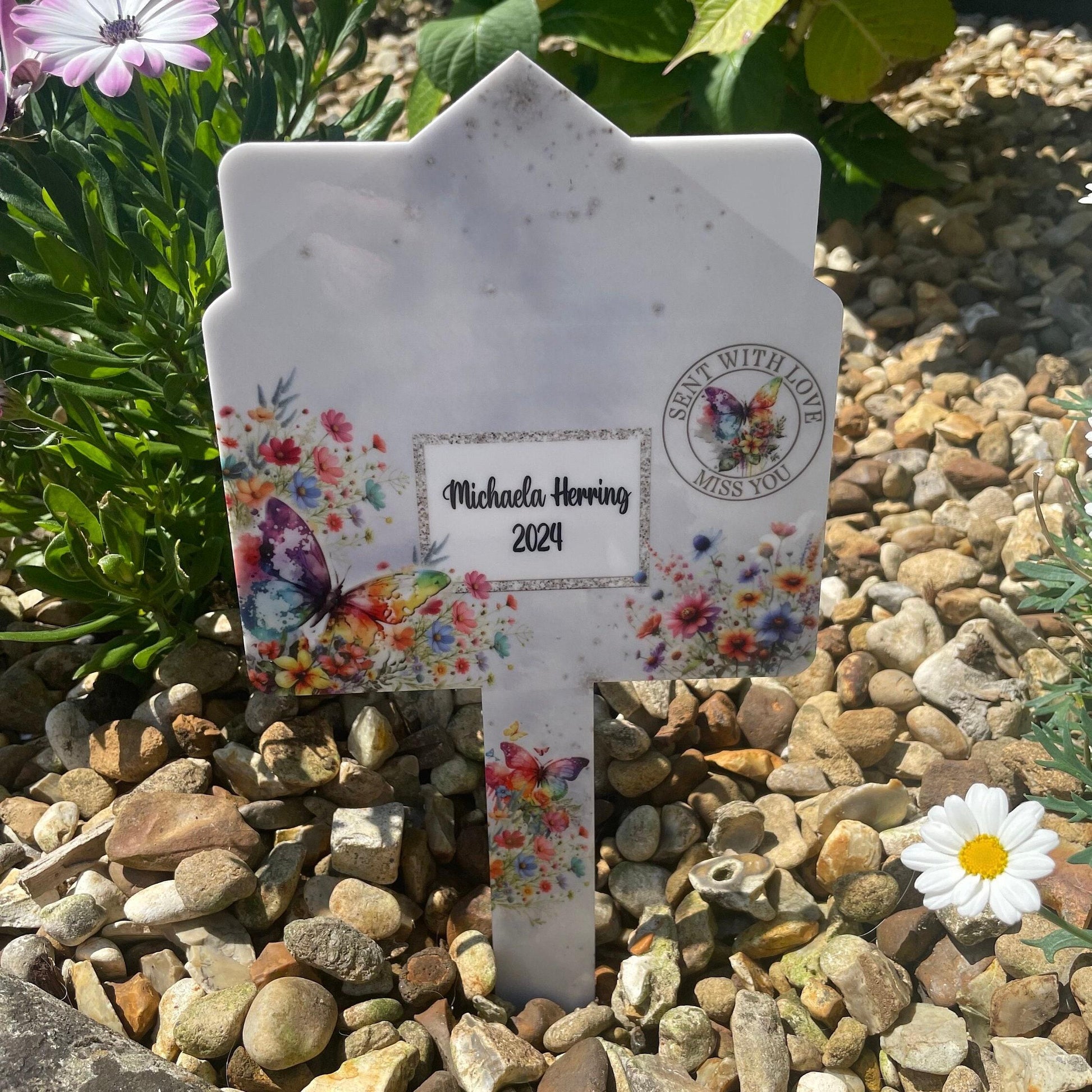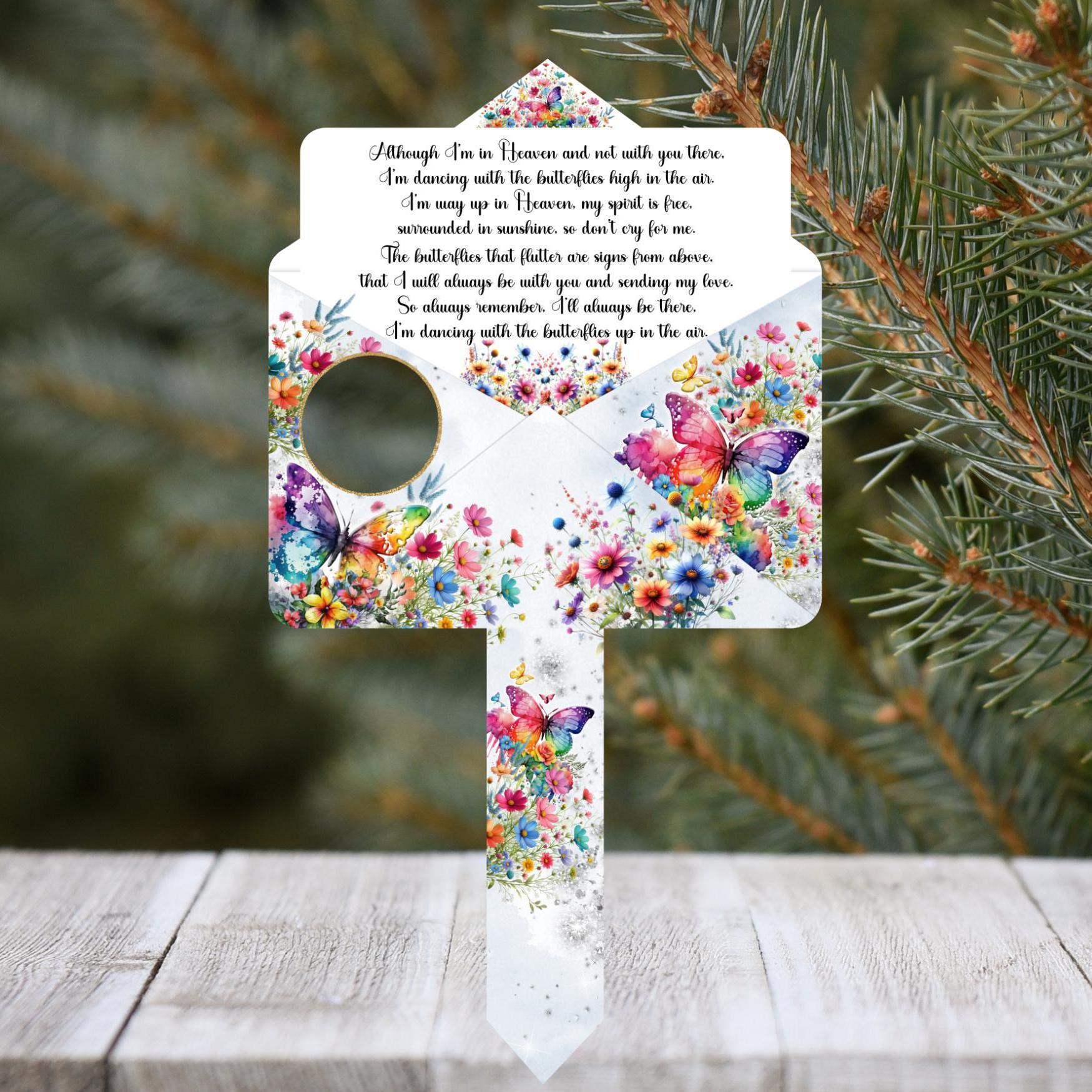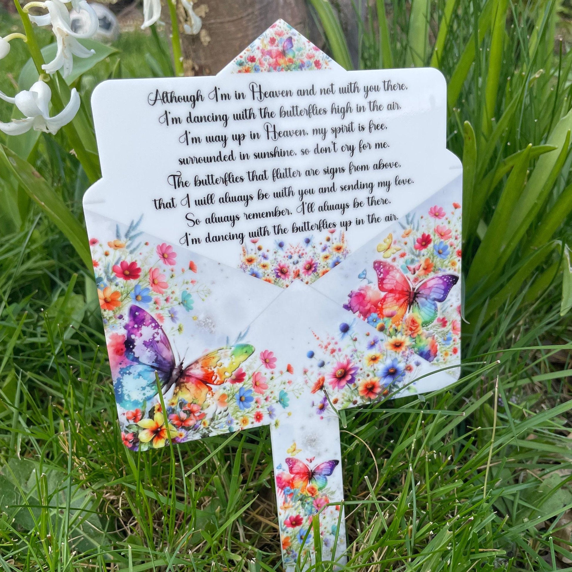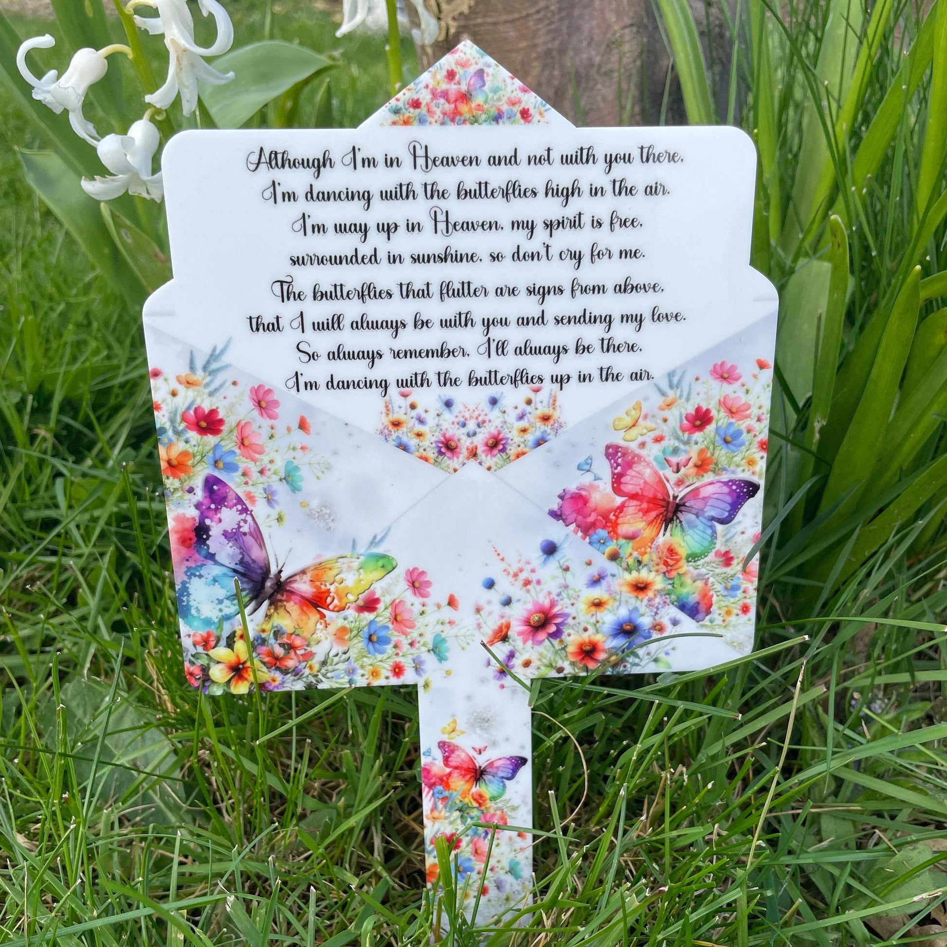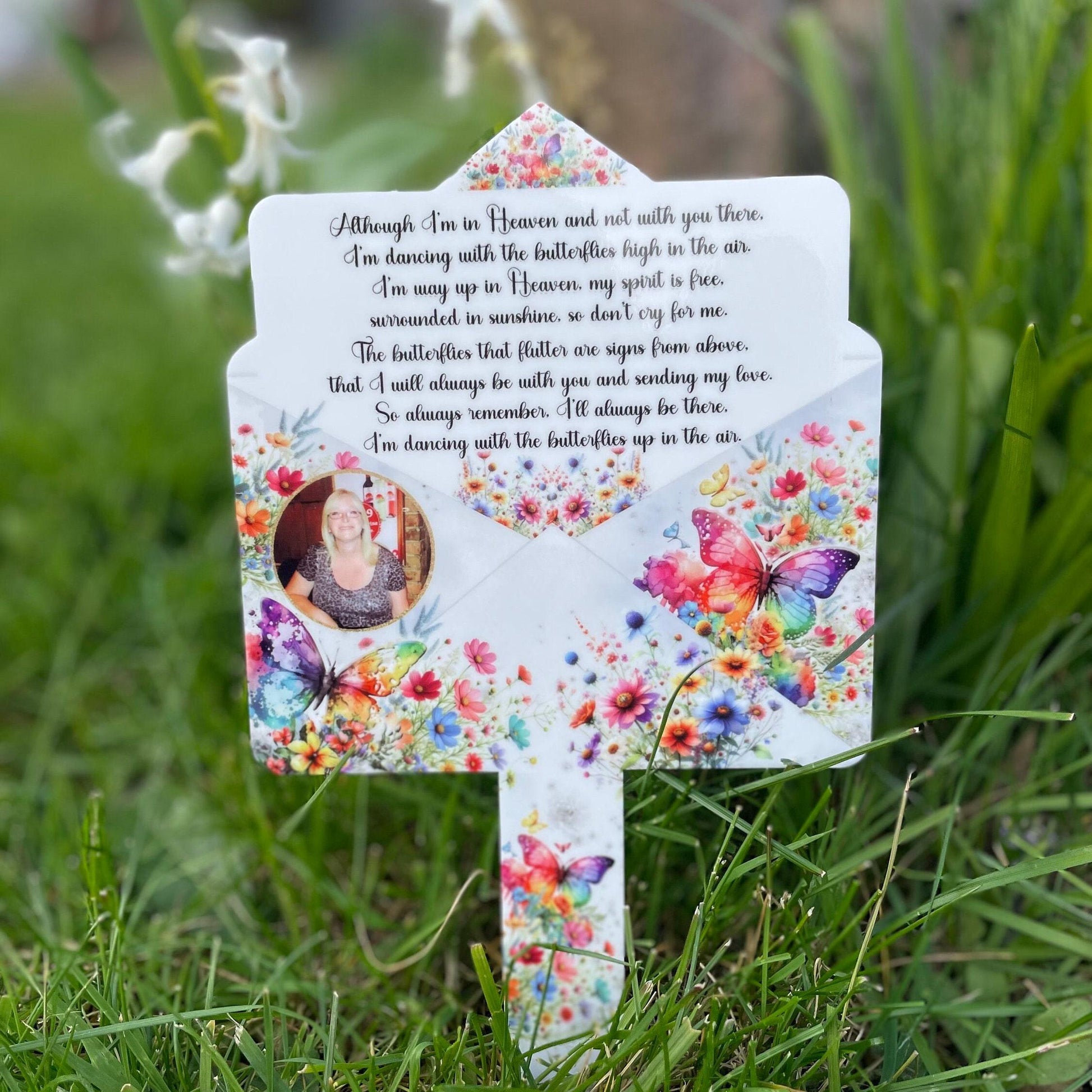 Our Butterfly Memorial Poem Letter Envelope Grave Marker offers a meaningful tribute to a cherished loved one. Featuring a vibrant rainbow butterfly amidst wildflowers, this 3mm acrylic marker is perfect for gravesides, gardens, or plant pots. Personalise it with your own photo and text, or select our heartfelt poem about eternal presence and love. The reverse side includes space for a name. Crafted with durable, fade-resistant sublimation printing, this 28cm by 15cm marker is designed for lasting outdoor display, providing a beautiful, enduring reminder of those no longer with us.
