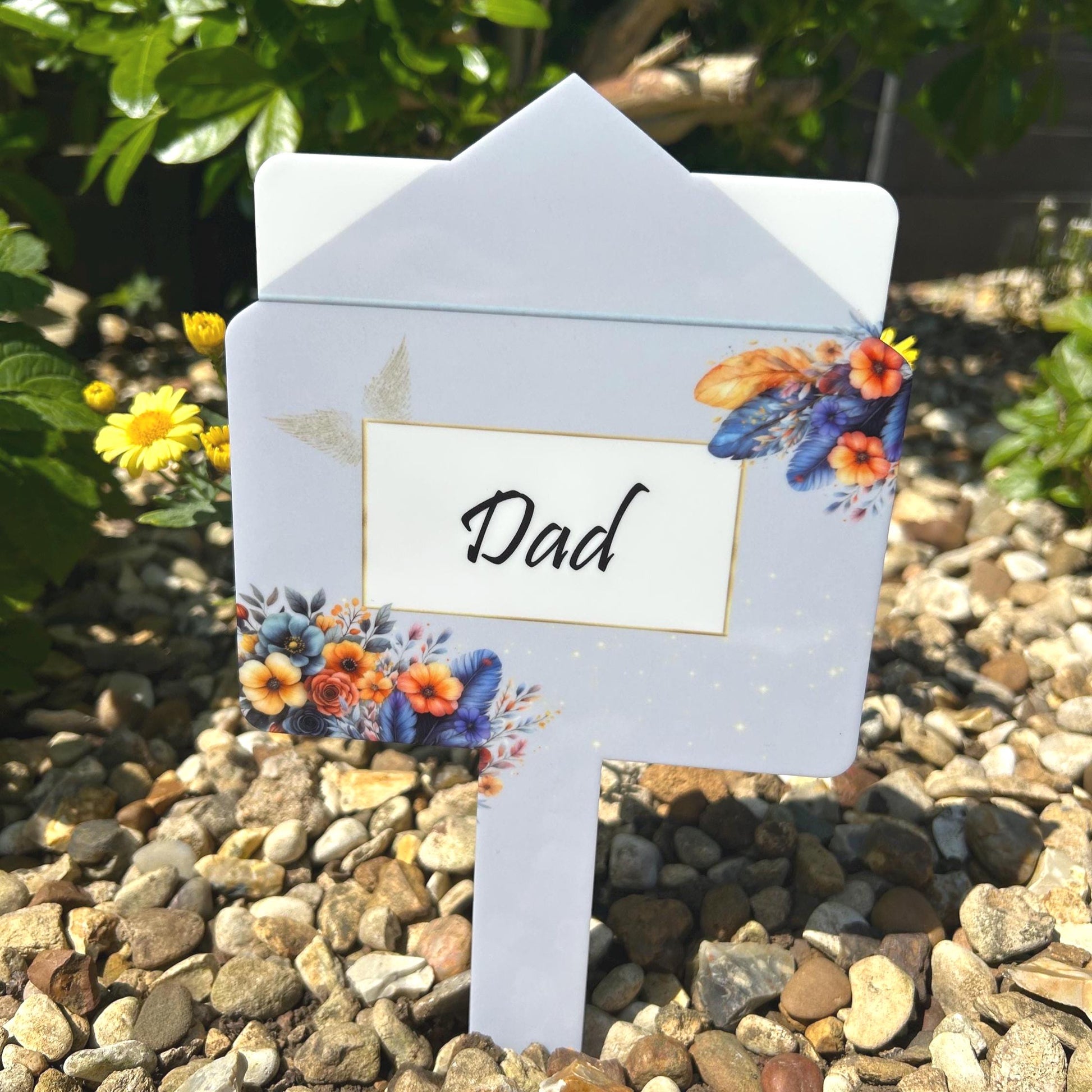 This envelope-shaped grave marker is a heartfelt tribute for Father’s Day, designed to honour a cherished dad who is no longer with us. Ideal for gravesides, gardens, or plant pots, it features a floral lantern motif available in various colours and can be personalised with your own text, photo, or our thoughtfully crafted poem. You may also add a name on the back of the marker. Made from durable 3mm acrylic with high-quality sublimation printing, it withstands outdoor conditions without fading. Dimensions are approximately 28cm by 15cm, making it a lasting and touching memorial.
