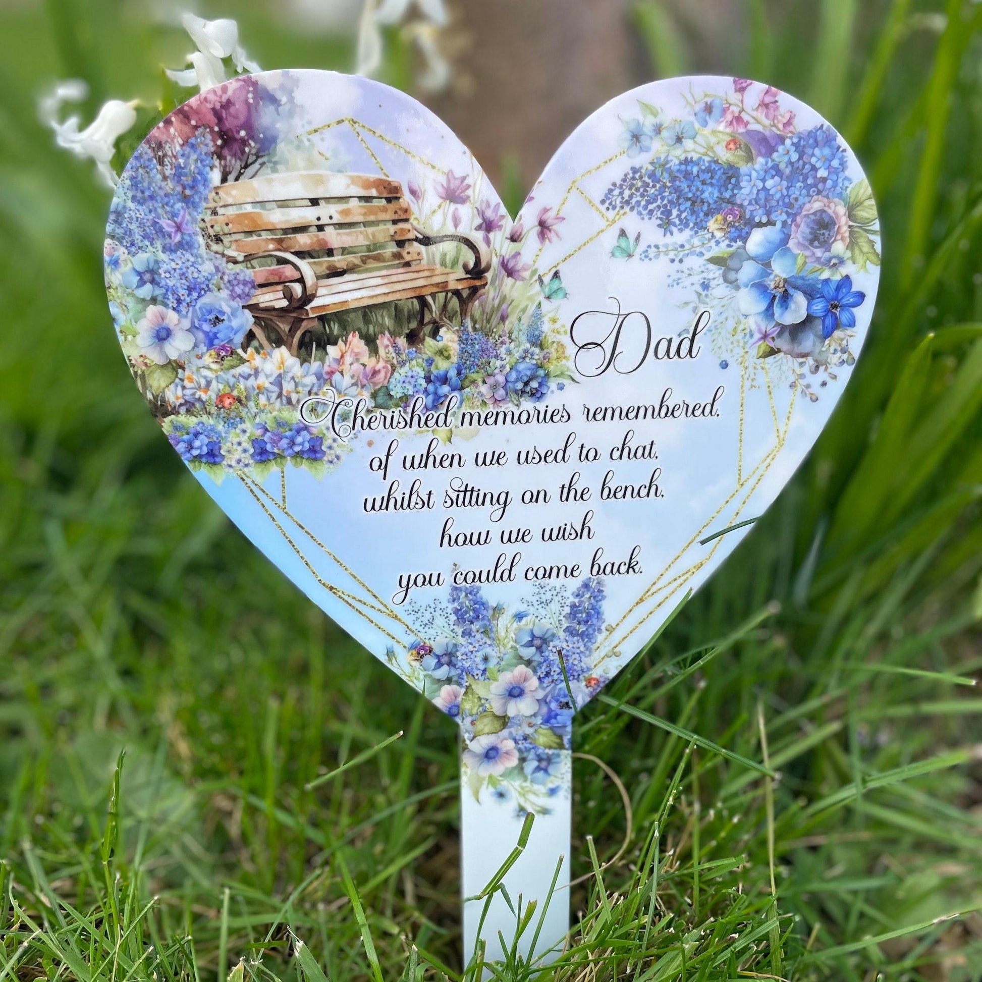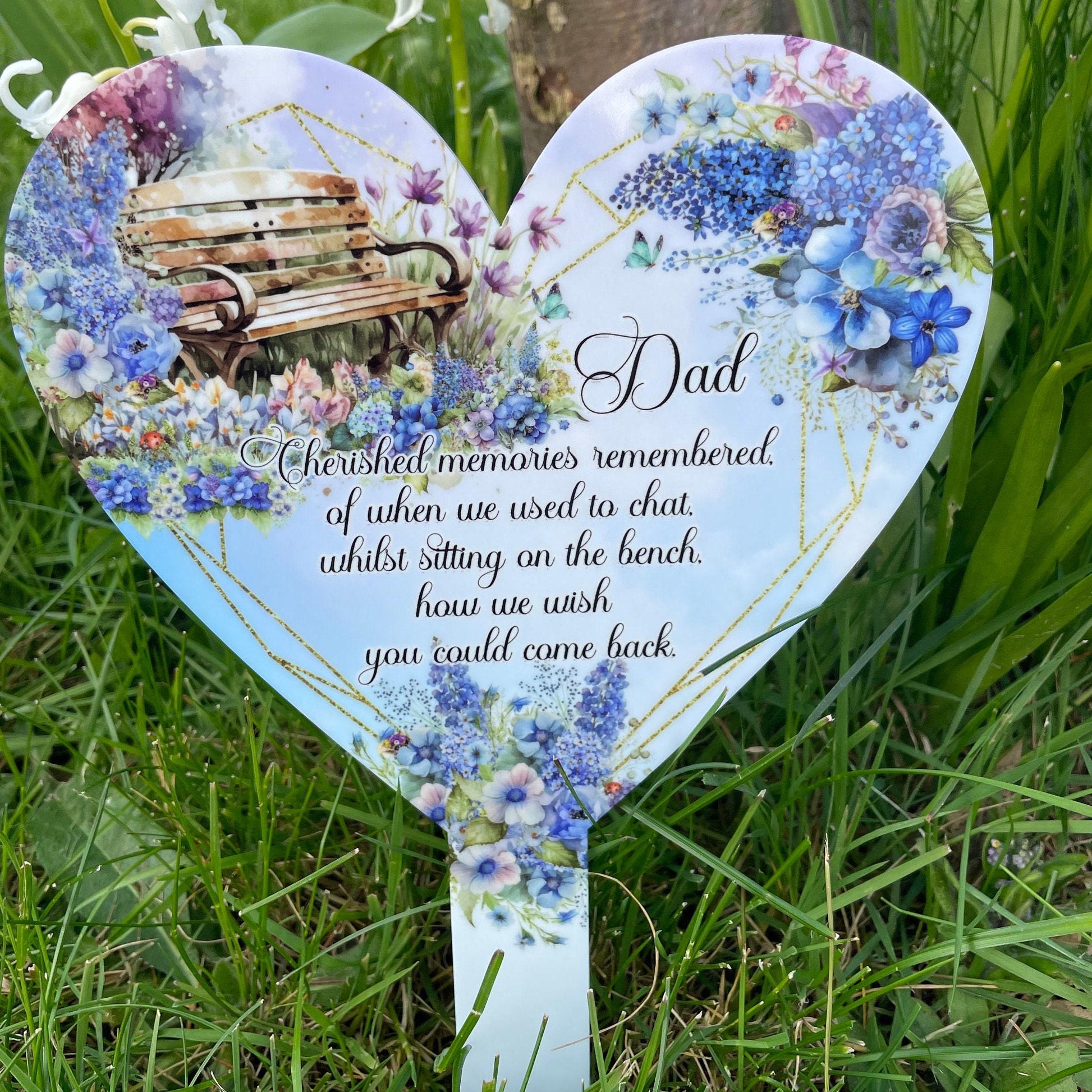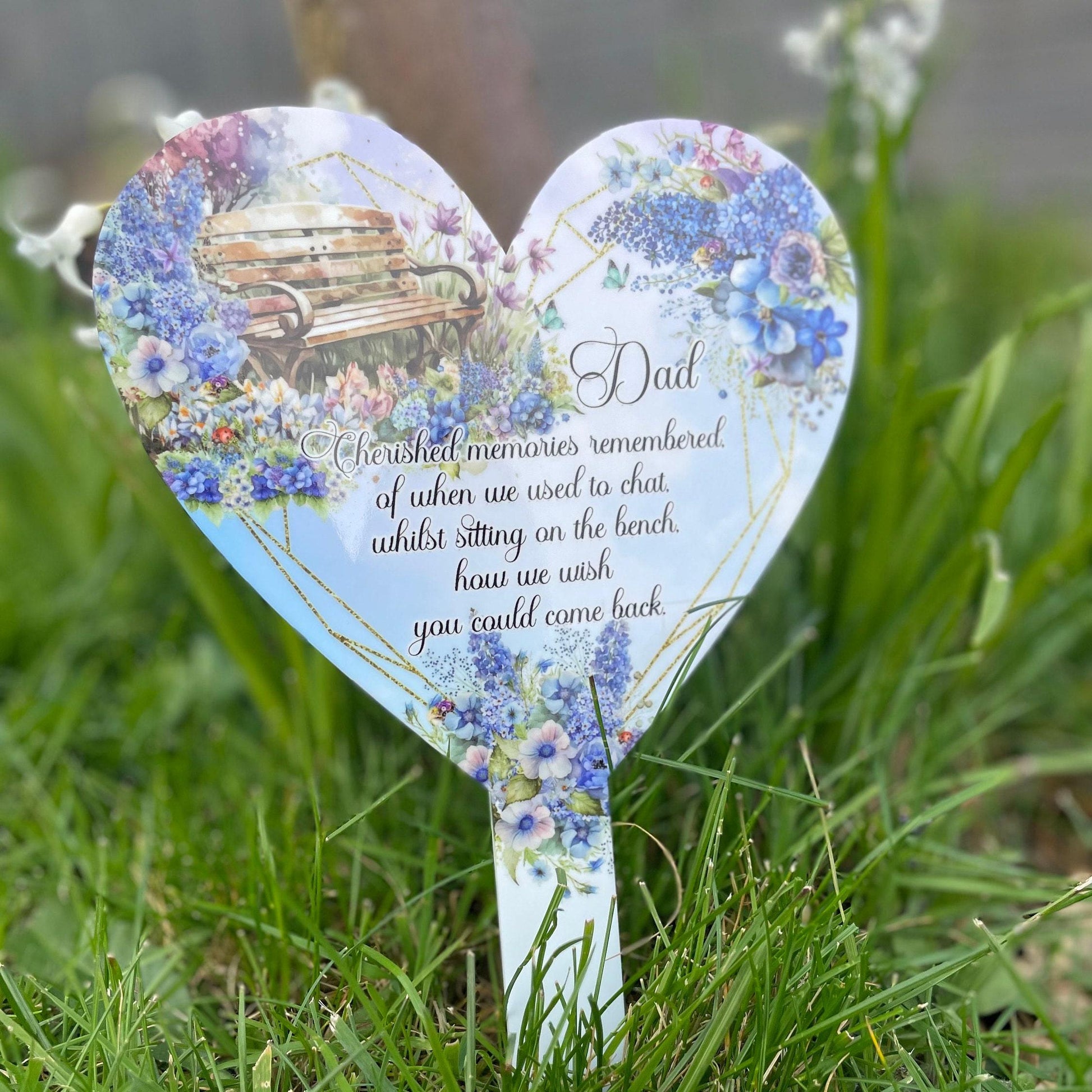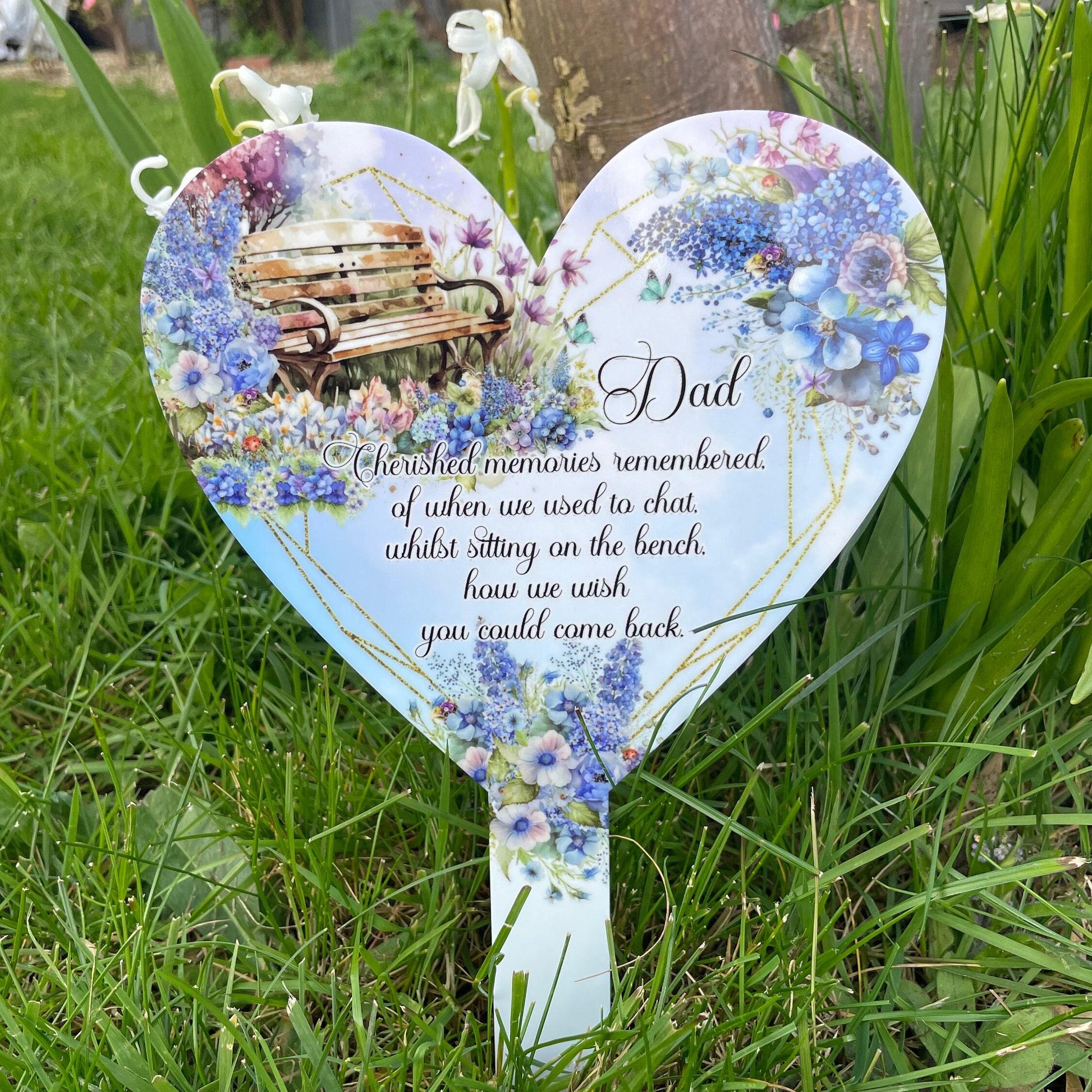 Our Dad Bench Memorial Flower Garden Heart Grave Marker offers a dignified tribute to a cherished loved one. Ideal for placement in gardens, at gravesides, or in plant pots, this heart-shaped marker features a beautiful flower bench poem design that can be personalized with your own message and photo or selected text. Crafted from durable 3mm acrylic and printed with high-quality sublimation, it ensures long-lasting outdoor display without fading. Measuring approximately 29cm by 19cm, this marker provides a meaningful and lasting way to honour and remember those who have passed.
