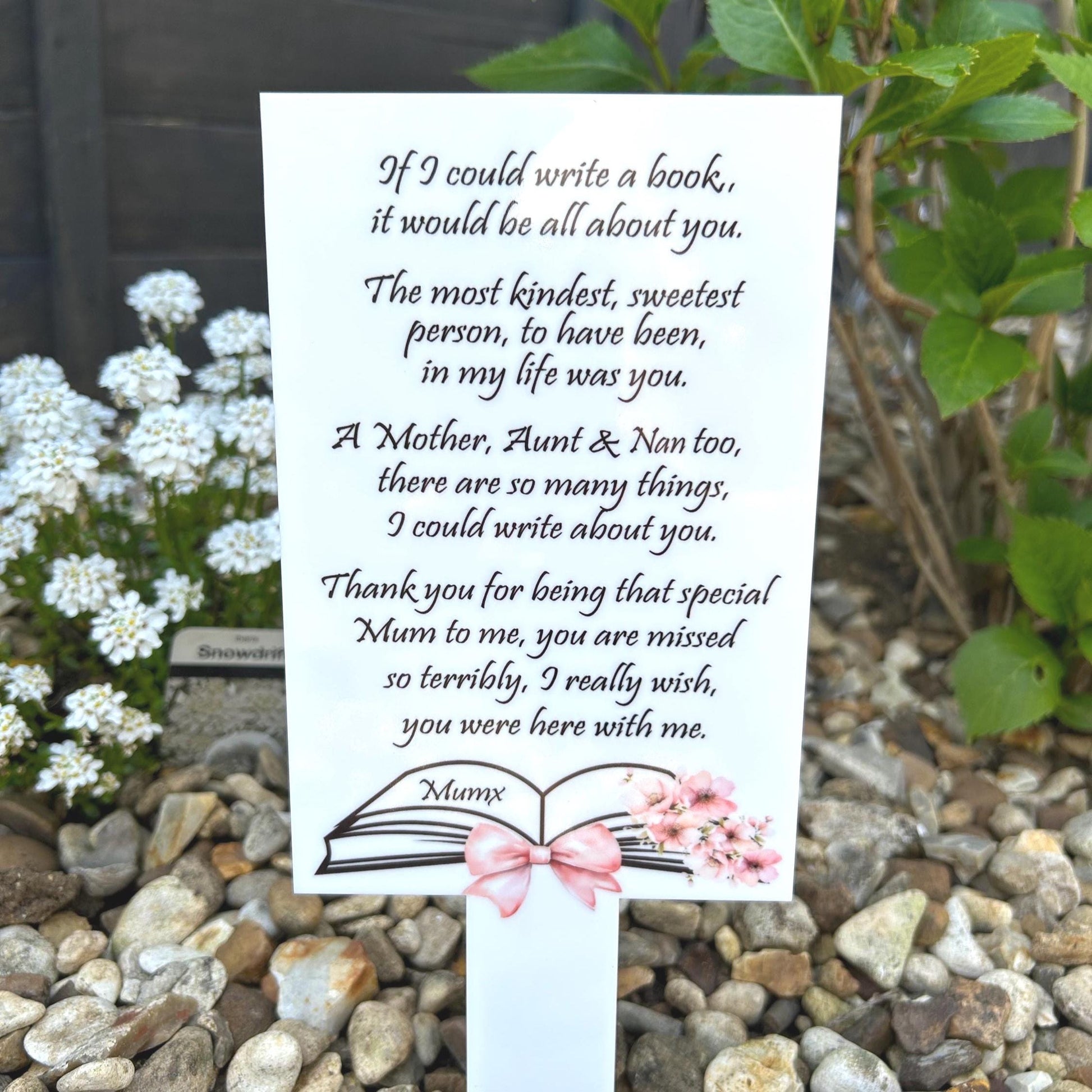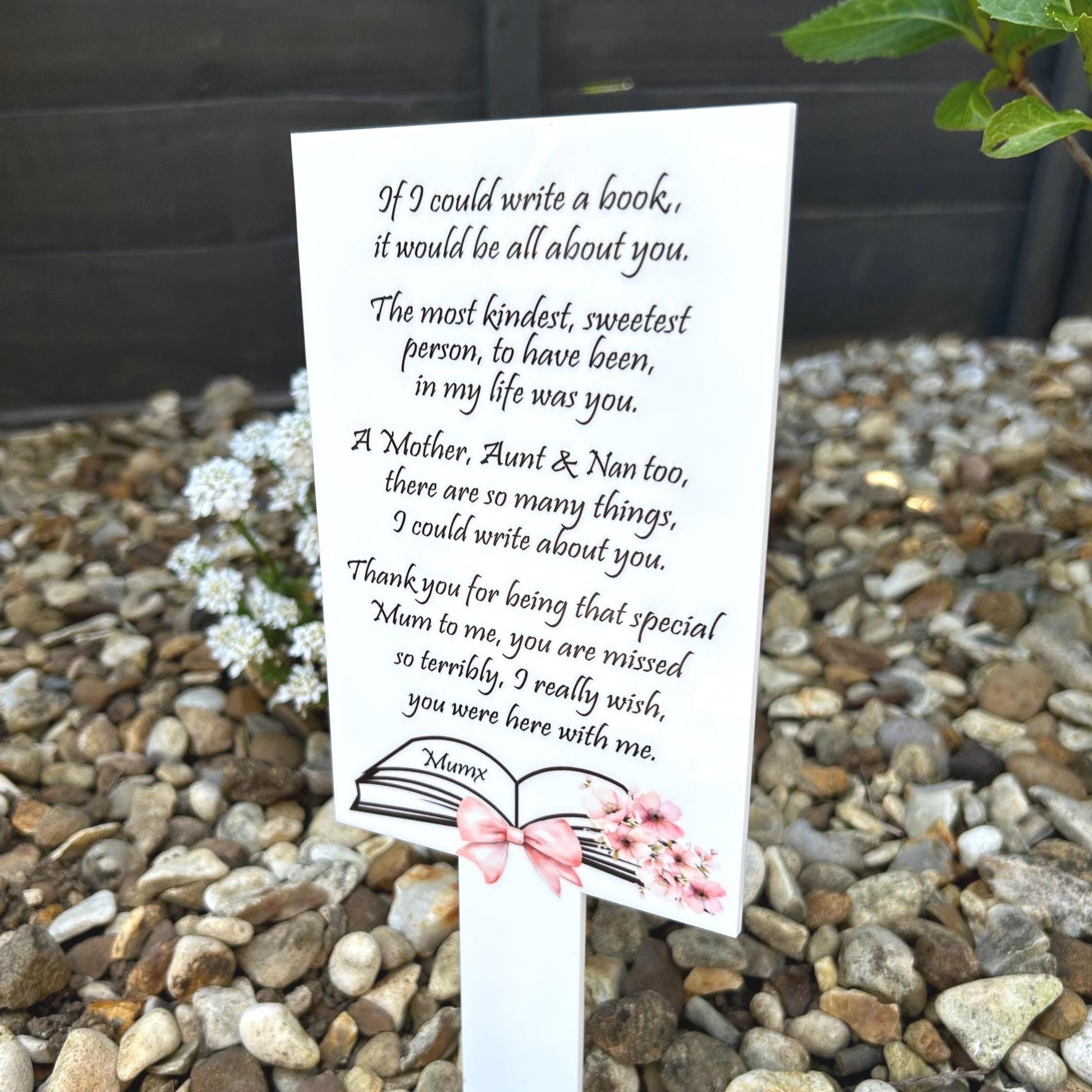 This beautifully shaped card letter grave marker is designed for Mother’s Day remembrance. Our “If I could write a book…” memorial markers offer a heartfelt tribute to a cherished loved one, ideal for gardens, gravesites, or plant pots. Featuring a touching poem that honours the kindness and love of a mother, aunt, or nan, it serves as a lasting expression of memory and affection. Crafted from durable 3mm acrylic with a high-quality sublimated print, this marker is weather-resistant and designed to preserve its vibrant appearance outdoors. Dimensions: approximately 30cm x 11.3cm.