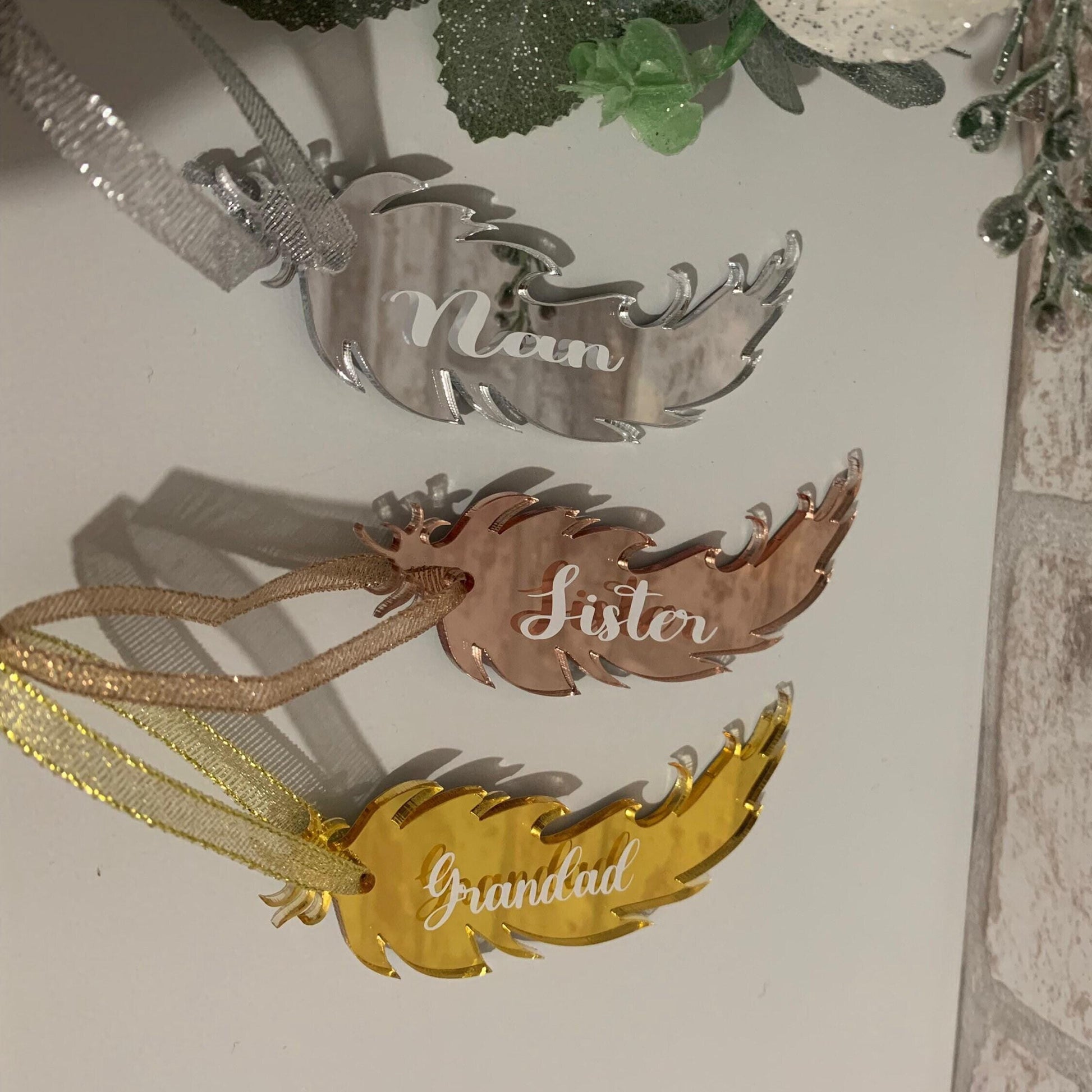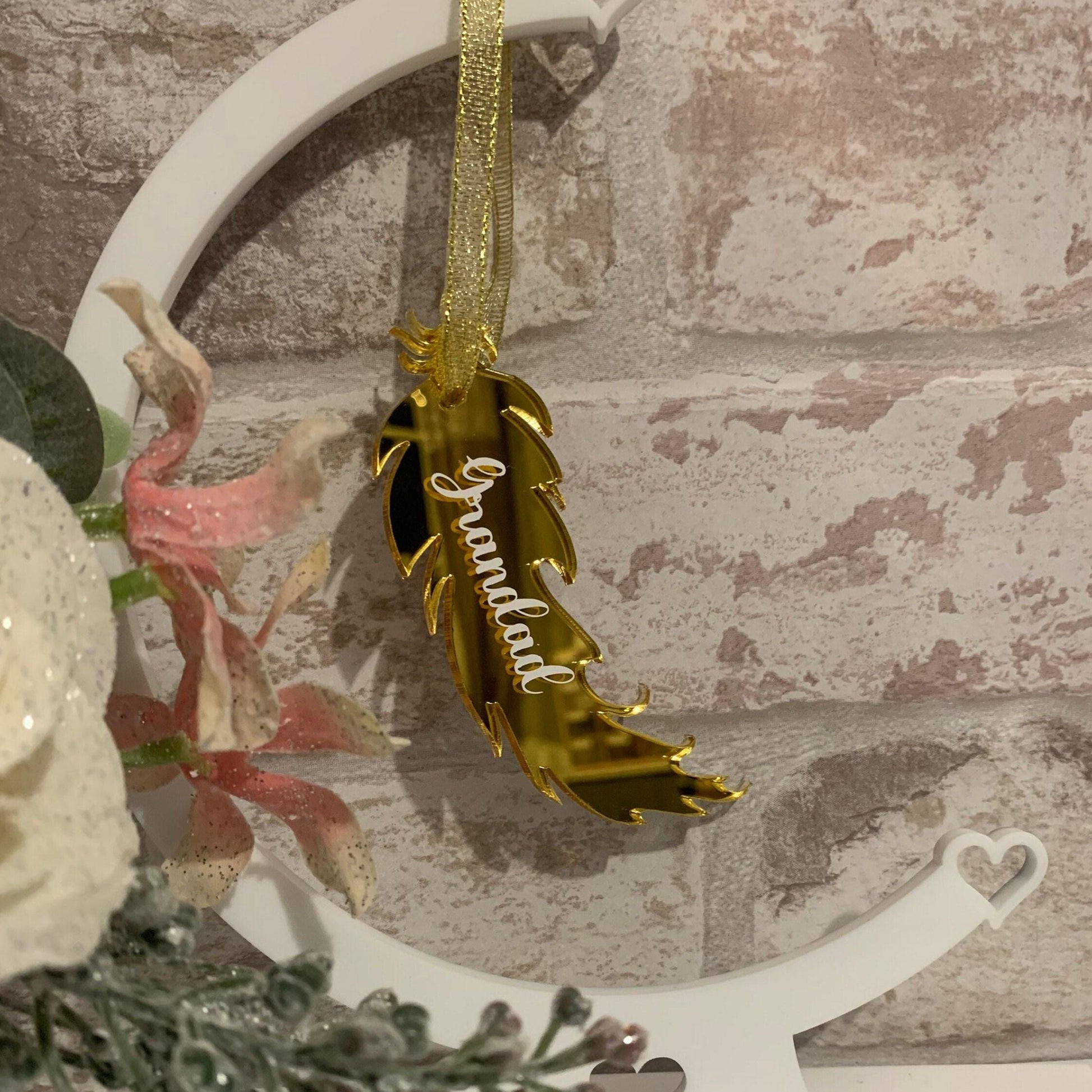 This personalised feather memorial bauble offers a heartfelt tribute to loved ones, ideal for Christmas or year-round remembrance. Available in Gold, Silver, and Rose Gold, each mirror chrome feather reflects light beautifully, enhancing its elegant appearance. Customisable with your chosen inscription and finished with a satin ribbon loop for easy hanging, this ornament measures approximately 9.5cm by 5.5cm. Perfect as a thoughtful gift or a lasting keepsake, it brings both comfort and beauty to any remembrance tree.