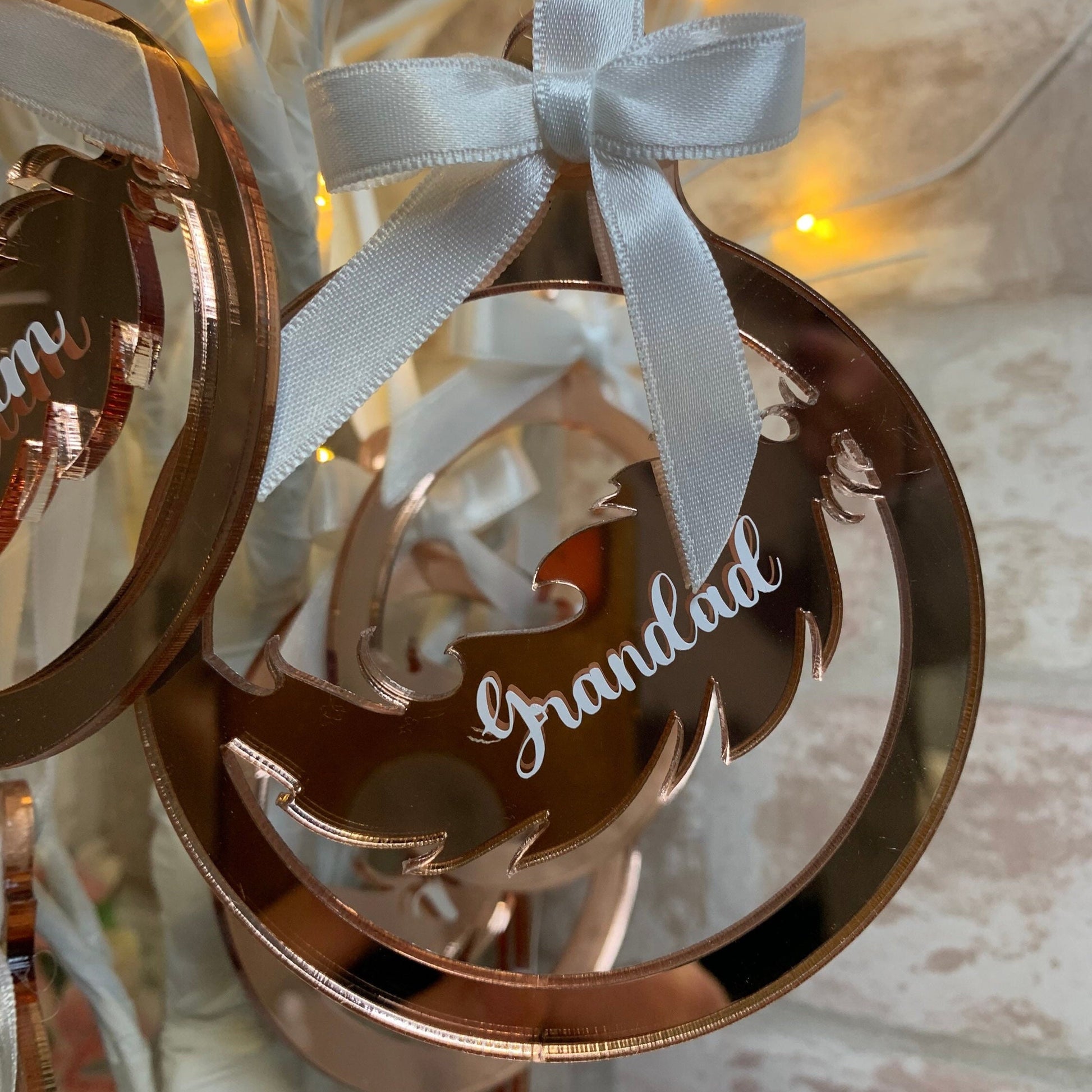 This elegant feather memorial decoration in rose gold can be personalized with any name or terms like 'Mum', 'Dad', 'Grandma', or 'Grandpa' to suit your preference. The featured design is in white, but font colors can be customized upon request. Crafted from rose gold mirror chrome acrylic, it is finished with a white satin ribbon and a delicate bow, beautifully reflecting Christmas lights to bring a sophisticated touch to your tree. Measuring 10 cm by 10 cm, this keepsake is ready to hang and equally charming year-round.
