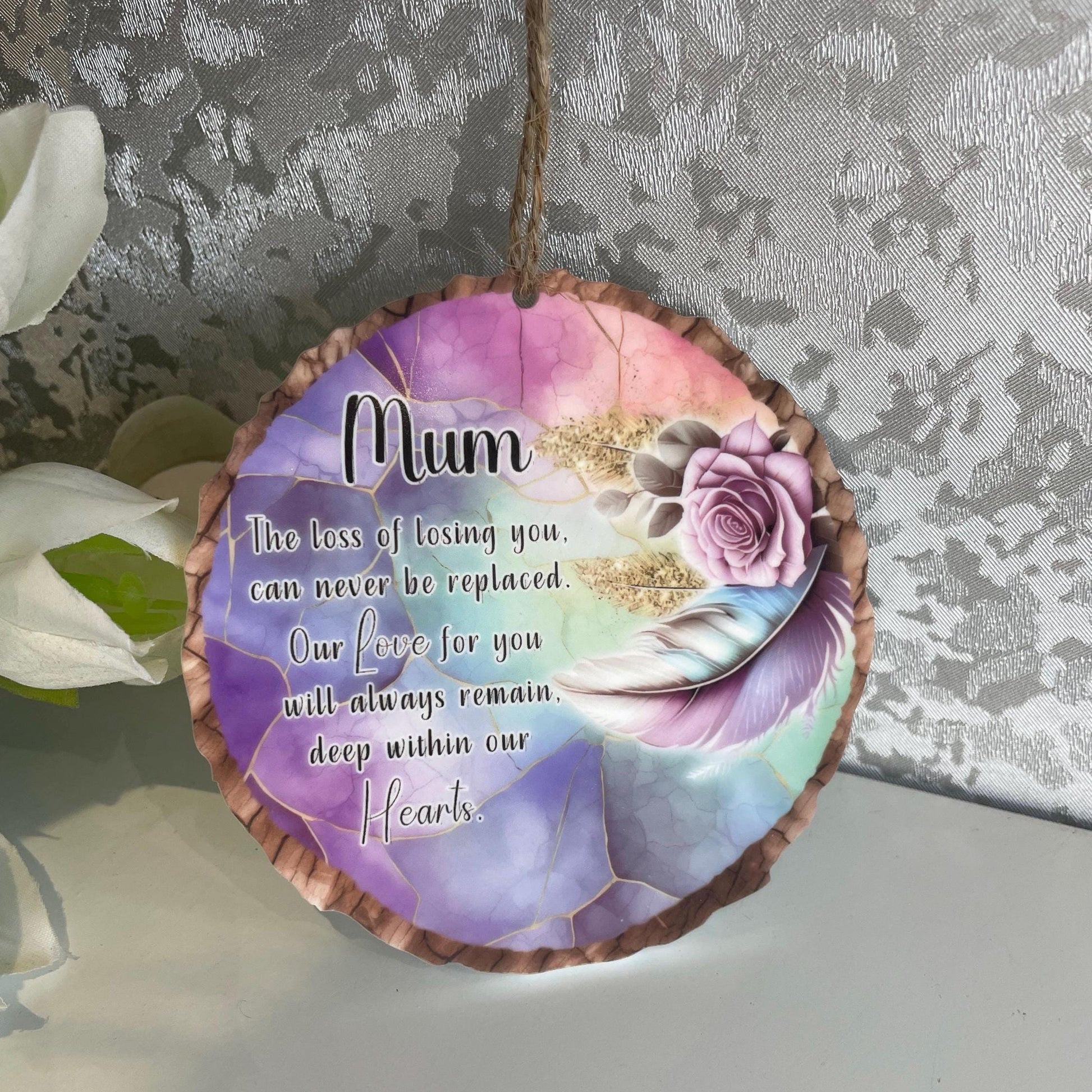 This elegant memorial wood slice features a heartfelt poem and is designed to be hung as a lasting tribute. Available in multiple styles, each log slice can be personalised with the included poem and a name, or you may provide your own text to be printed on durable acrylic for enduring quality. Perfect as a keepsake to display in your home or on a Christmas tree, the poem reads: "The loss of losing you, can never be replaced. My Love for you will always remain, deep within my heart," with the option to change the final line to "OUR Hearts." Select your preferred design and personalise your message at checkout. Dimensions: 10cm x 10cm.