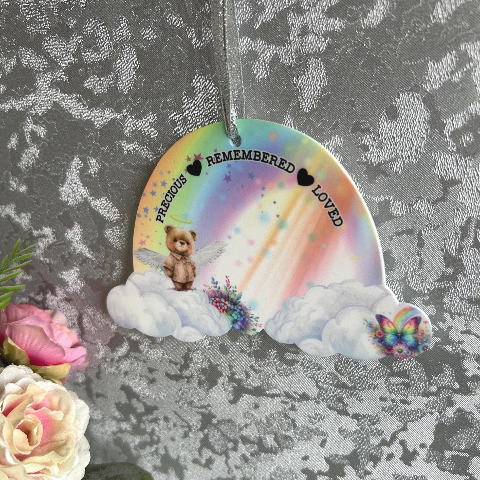 This personalised memorial plaque serves as a heartfelt tribute to infants and children, offering a meaningful way to honour those no longer with us. Featuring a delicate rainbow bridge design with a teddy bear with wings in pink, blue, or brown, it displays the words PRECIOUS. REMEMBERED. LOVED. There is space to include a custom name or message, creating a unique keepsake. Measuring 11.9cm by 7.9cm and hung by a ribbon (colour may vary), this ornament is an expert choice for a thoughtful remembrance gift or temporary grave decoration.
