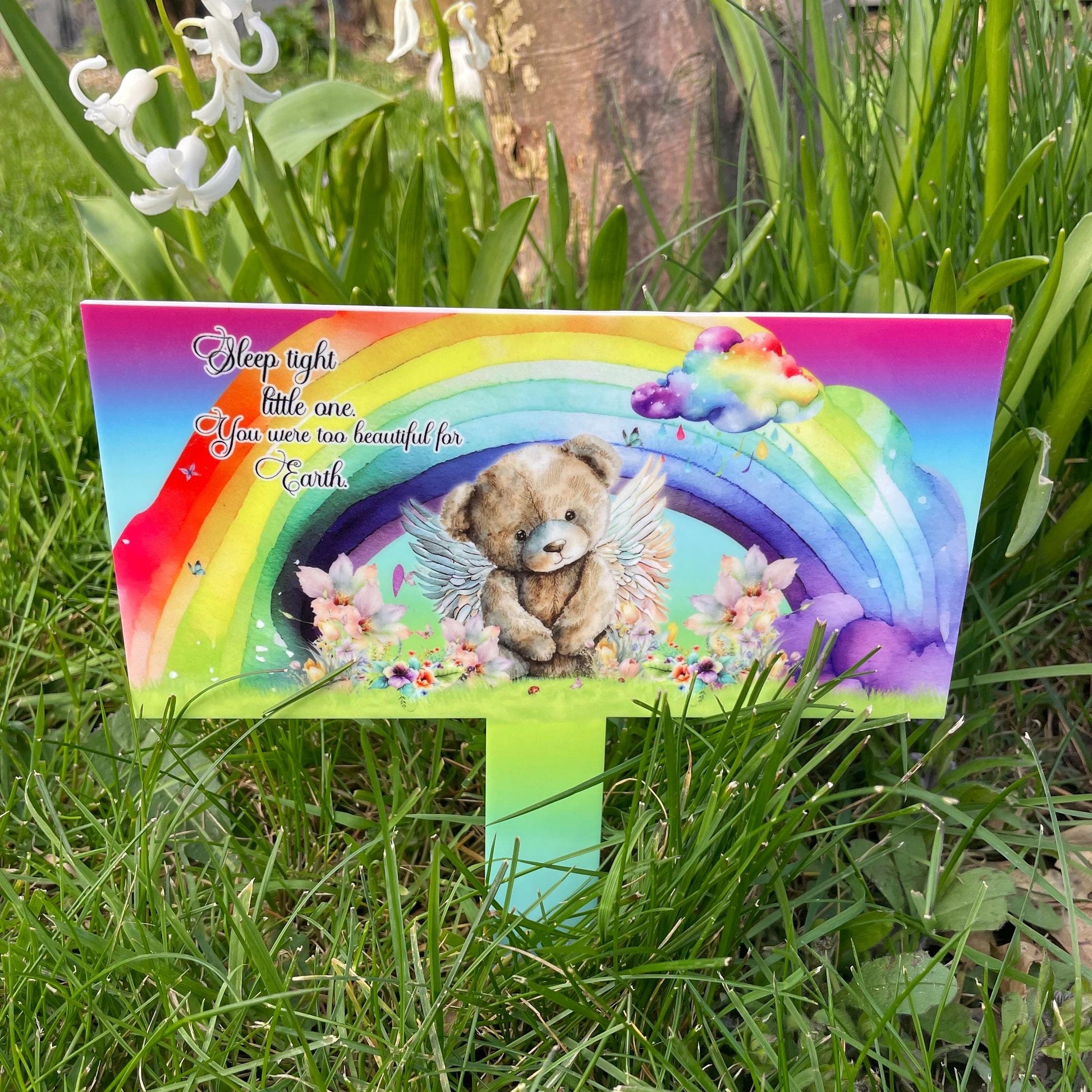 This personalised memorial grave marker features a teddy bear and rainbow design, accompanied by the quote: *Sleep tight little one, you were too beautiful for earth*. You can choose to include this wording or customize it with your own text. A name or image can be added above in the cloud—please provide details at checkout. Crafted with a high-quality sublimated print on a rectangular acrylic marker (approximately 23cm x 20cm), it offers durable, fade-resistant remembrance. Please verify all spellings carefully, as corrections cannot be made. Note that colours may vary due to screen settings.