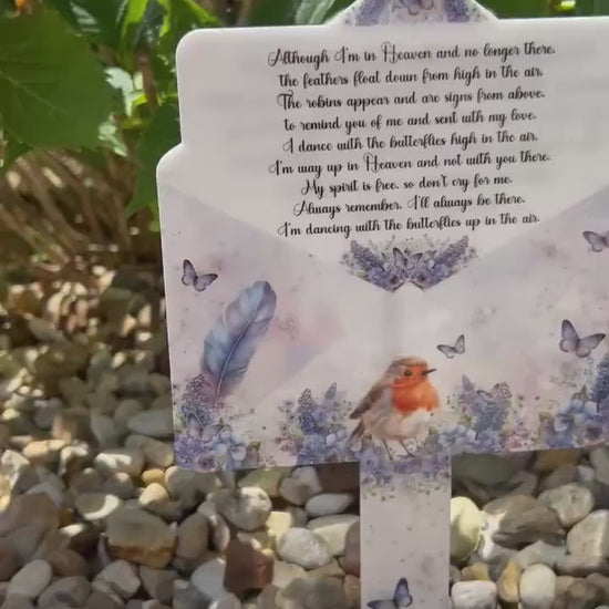 This robin-shaped letter envelope grave marker offers a heartfelt way to honour a cherished loved one. Designed for gardens, gravesides, or plant pots, it features a robin motif that can be personalised with your chosen text and photo or selected pre-set text. The back of the envelope allows for a name inscription. Crafted from 3mm acrylic with a high-quality sublimation print, this durable memorial marker resists fading and withstands outdoor conditions. Measuring approximately 28cm by 15cm, it includes a touching poem to provide comfort and remembrance.