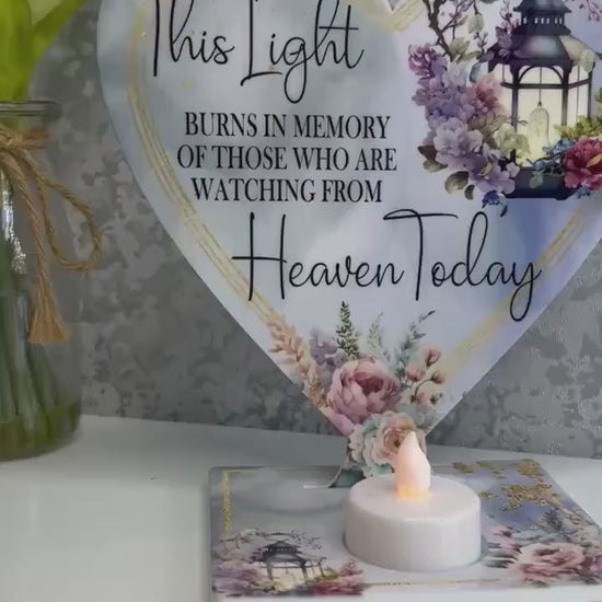 This memorial heart candle plaque serves as a tribute to loved ones watching from heaven. Perfect for commemorating a Mum, Dad, Nan, or other treasured family members, it can be personalised with a name or a custom poem on the base—just provide your details at checkout or reach out to us. Made from white acrylic with hand-printed, high-quality ink, this 18cm tall keepsake is suitable for display at home, gravesides, or weddings. It arrives flat-packed in two simple-to-assemble pieces, with glue recommended for lasting stability. Colour tones may differ slightly from screen to product. For safety, we advise using battery-operated tea lights only.